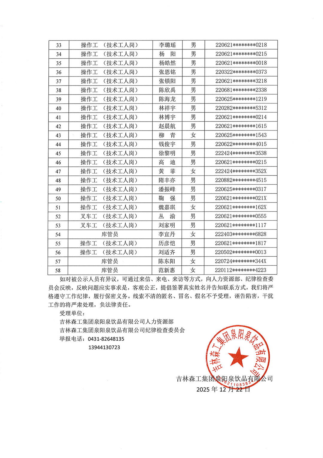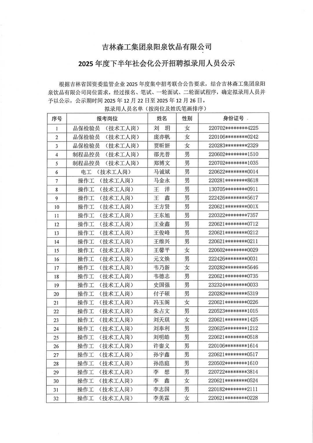 吉林森工集團泉陽泉飲品有限公司2025年度下半年社會化公開招聘擬錄用人員公示